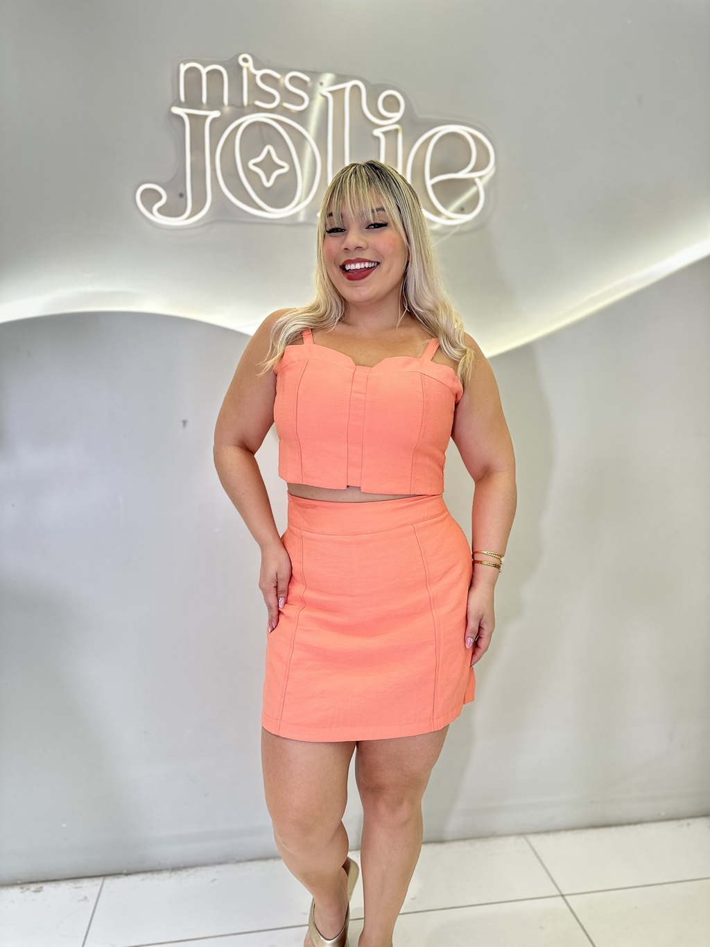 Esse conjunto compoe cropped e short saia,